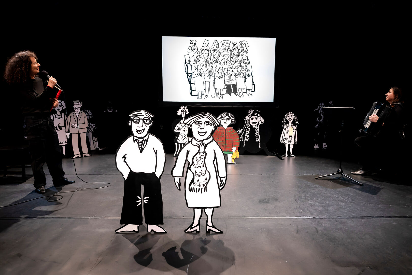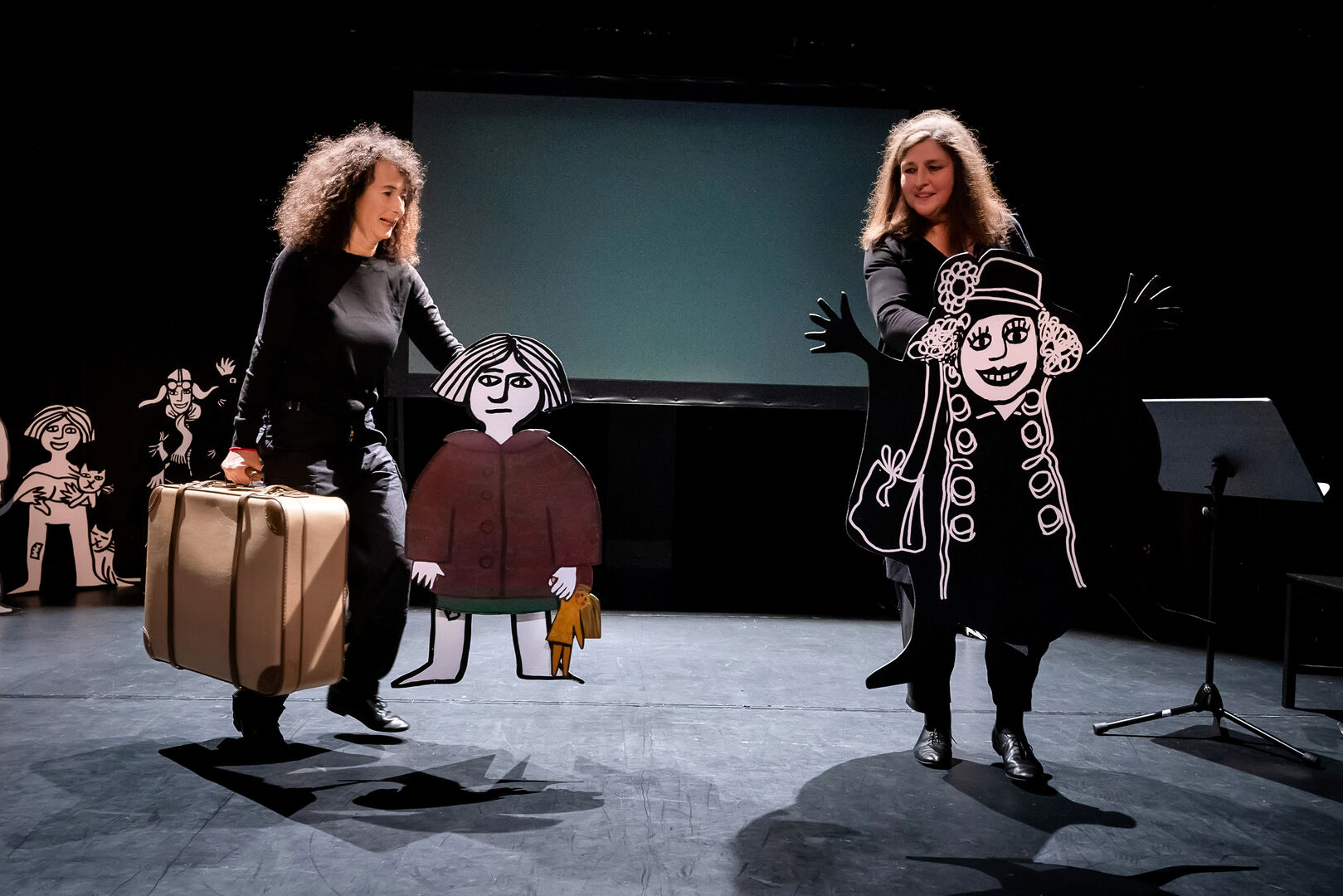 zwei schauspielerinnen mit pappfiguren und einem koffer | © theater la senty mentizwei schauspielerinnen mit pappfiguren und einem koffer | © theater la senty mentieine bühne mit pappfiguren, eine person links mit einem mikrofon, eine person rechts mit einem akkordeon, im hintergrund eine leinwand mit projektion | © theater la senty mentieine bühne mit pappfiguren, eine person links mit einem mikrofon, eine person rechts mit einem akkordeon, im hintergrund eine leinwand mit projektion | © theater la senty menti