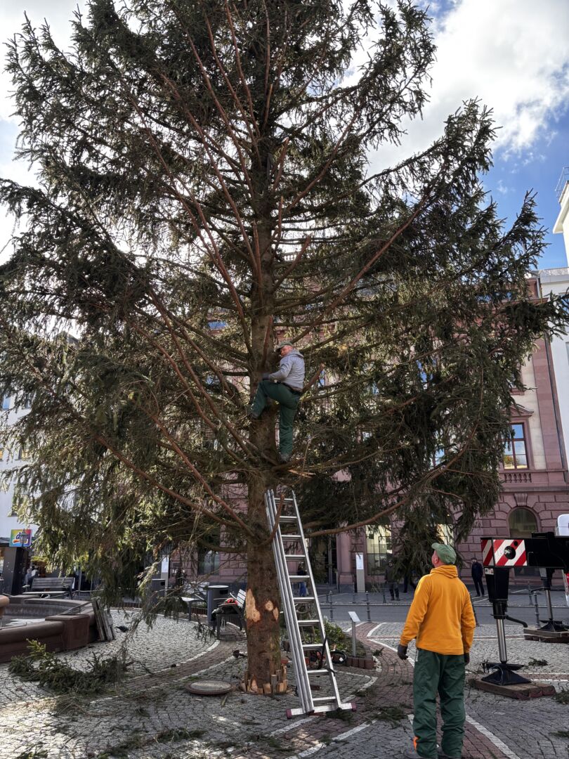 Bad Homburg v. d. Höhe. Er (oder sie) ist 40 Jahre alt, rund 18 Meter hoch, bringt stolze vier Tonnen auf die Waage und stammt aus dem Vogelsberg – genauer gesagt aus der Nähe von Rudingshain: Bad Homburgs Weihnachtsbaum ist auf dem Kurhausvorplatz angekommen. Ein untrügliches Zeichen, dass die Adventszeit vor der Tür steht. Am Donnerstag, 30. Oktober 2025, hatte die schöne Rotfichte ihre eineinhalbstündige Anreise absolviert und wurde vor dem Kurhaus von der Horizontalen in die Vertikale gebracht. Ausgewählt wurde sie von Betriebshof-Mitarbeiter Thilo Kappus, der gemeinsam mit der Fritzges Forstwirtschaft für das Fällen, den Transport und das fachgerechte Aufstellen verantwortlich zeichnete – ein Zusammenspiel von Erfahrung, Präzision und Teamarbeit. In den kommenden Tagen werden dann noch die LED-Leuchtstränge mittels Wickeltechnik (um die Äste gewickelt) angebracht. „Jetzt kann die Adventszeit kommen“, freut sich Oberbürgermeister Alexander Hetjes.