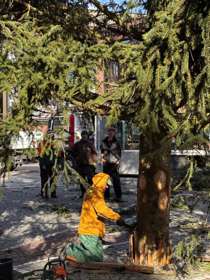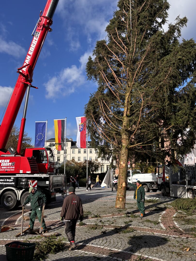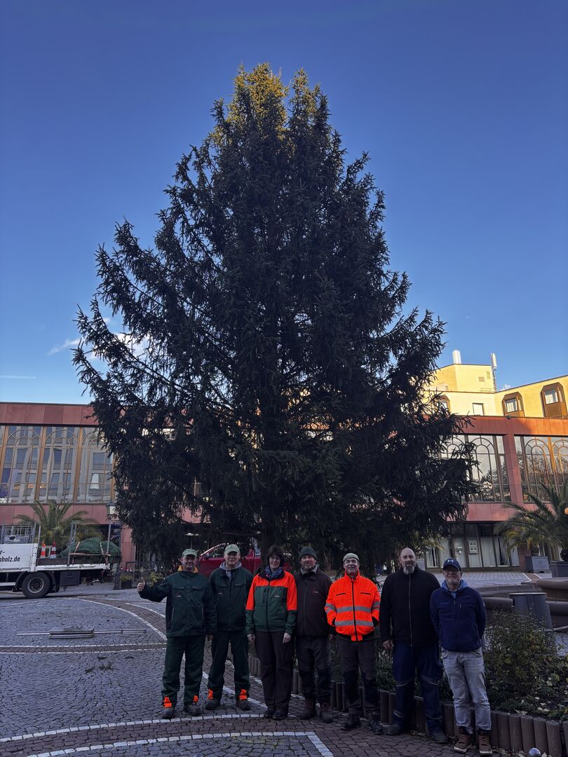 Bad Homburg v. d. Höhe. Er (oder sie) ist 40 Jahre alt, rund 18 Meter hoch, bringt stolze vier Tonnen auf die Waage und stammt aus dem Vogelsberg – genauer gesagt aus der Nähe von Rudingshain: Bad Homburgs Weihnachtsbaum ist auf dem Kurhausvorplatz angekommen. Ein untrügliches Zeichen, dass die Adventszeit vor der Tür steht. Am Donnerstag, 30. Oktober 2025, hatte die schöne Rotfichte ihre eineinhalbstündige Anreise absolviert und wurde vor dem Kurhaus von der Horizontalen in die Vertikale gebracht. Ausgewählt wurde sie von Betriebshof-Mitarbeiter Thilo Kappus, der gemeinsam mit der Fritzges Forstwirtschaft für das Fällen, den Transport und das fachgerechte Aufstellen verantwortlich zeichnete – ein Zusammenspiel von Erfahrung, Präzision und Teamarbeit. In den kommenden Tagen werden dann noch die LED-Leuchtstränge mittels Wickeltechnik (um die Äste gewickelt) angebracht. „Jetzt kann die Adventszeit kommen“, freut sich Oberbürgermeister Alexander Hetjes.