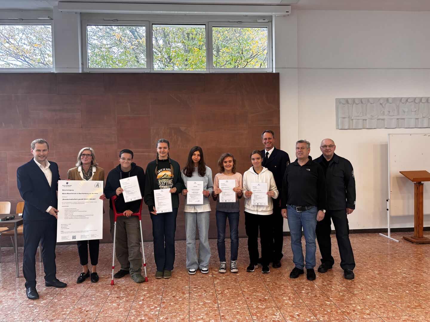 Die Projektwoche fand in der Bad Homburger Feuerwache statt und wurde von ehrenamtlichen und hauptamtlichen Feuerwehrkräften begleitet. Den Abschluss bildete eine groß angelegte Räumungs- und Brandschutzübung in den Räumlichkeiten und auf dem Gelände der Maria-Ward-Schule, an der die gesamte Schulgemeinde teilnahm. Schulleiterin Dr. Fuhrmann löste den Übungsalarm persönlich aus und zeigte sich über das Engagement und die Leistungen ihrer Schulfeuerwehr begeistert.  „Mein Dank gilt allen Beteiligten aus unserer Feuerwehr, dem schulischen Projektleiter Markus Gruber und natürlich auch der Schulleiterin, Dr. Fuhrmann, für ihre Unterstützung“, sagte Bürgermeister und Feuerwehrdezernent Dr. Oliver Jedynak bei der Urkundenübergabe in der Aula der Maria-Ward-Schule. In ihrem Grußwort während eines kleinen Empfangs im schuleigenen Café Marie betonte Dr. Fuhrmann die Bedeutung des Ehrenamts für die Gesellschaft und hob den Vorbildcharakter der Maria-Ward-Schulfeuerwehr hervor.